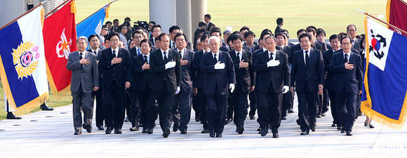 김한길 민주당 대표와 신임 지도부가 6일 오전 서울 동작동 국립현충원을 찾아 의장대의 사열 속에서 현충원안으로 입장하고 있다.