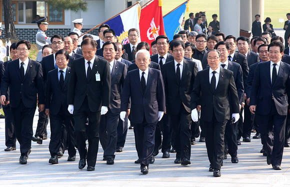 김한길 민주당 신임 대표 및 지도부가 6일 오전 서울 동작동 국립 서울현충원 참배 방문에서 의장단의 사열을 받으며 입장하고 있다.