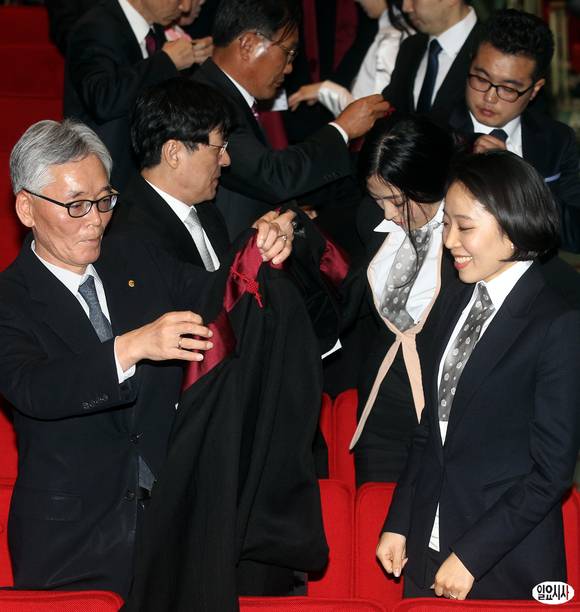 6일 오후 정부과천청사에서 열린 신임검사 임관식에서 신임검사의 가족들이 법복을 입혀주고 있다.