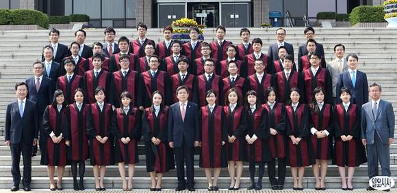 6일 오후 정부과천청사에서 열린 신임검사 임관식에서 황교안 법무부 장관이 신임검사들과 함께 기념촬영을 하고 있다.