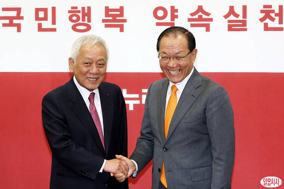 황우여 새누리당 대표(사진 오른쪽)가 6일 오후 국회 당대표실에서 김한길 민주당 신임 대표와 악수를 나누며 활짝 웃고 있다.