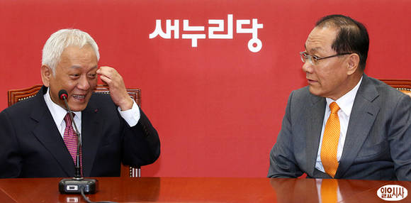 황우여 새누리당 대표(사진 오른쪽)가 6일 오후 국회 당대표실에서 김한길 민주당 신임 대표와의 회동에서 이야기를 나누고 있다.