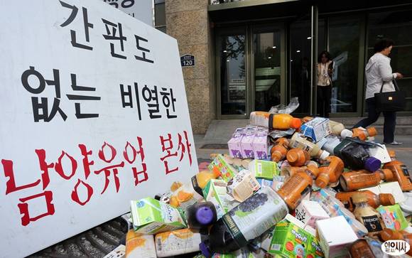 6일 서울 중구 남대문로 남양유업 본사 앞에서 남양유업 대리점 피해자협의회 회원들이 자사 물품을 불법으로 강매한데 대해 이를 항의하는 의미로 바닥에 쏟아부은 제품들이 방치돼 있다.