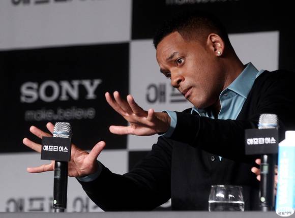 7일 오전 서울 여의도 콘래드 호텔에서 열린 영화 '애프터 어스' 내한 기자회견에서 배우 윌 스미스가 마이크를 이용해 마술 연출을 하고 있다.일요시사=송의주 기자(songuiju@ilyosisa.co.kr)