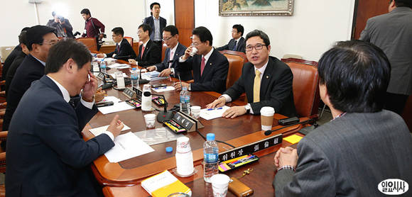 장윤석 국회 예결위원장(사진 오른쪽)이 7일 오전 예결위 예산안조정 계수조정소위원회에서 새누리당 김학용 간사(오른쪽에서 첫 번째)와 이야기를 나누고 있다.일요시사=나경식 기자(rusia1973@ilyosisa.co.kr)