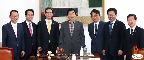 장윤석 국회 예결위원장(가운데)이 7일 오전, 예결위 예산안조정소위원회 회의실에서 여야 위원들과 얘기를 나누고 있다. 왼쪽부터 새누리당 김도읍, 류성걸 의원, 김학용 간사, 장 위원장, 민주당 최재성 간사, 김춘진, 박범계 의원일요시사=나경식 기자(rusia1973@ilyosisa.co.kr)