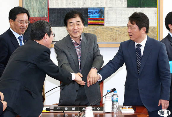 장윤석 국회 예결위원장(가운데)이 7일 오전 예결위 예산안조정소위원회 회의실에서 새누리당 김학용 간사, 민주당 최재성 간사와 악수를 나누고 있다.일요시사=나경식 기자(rusia1973@ilyosisa.co.kr)