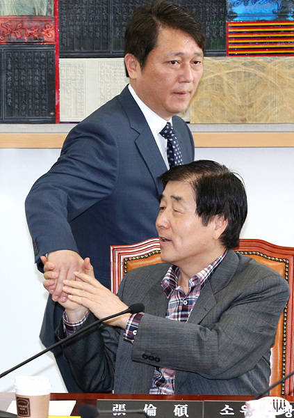 장윤석 국회 예결위원장(사진 오른쪽)이 7일 오전 예결위 예산안조정소위원회 회의실에서 민주당 최재성 간사와 악수를 나누고 있다.일요시사=나경식 기자(rusia1973@ilyosisa.co.kr)