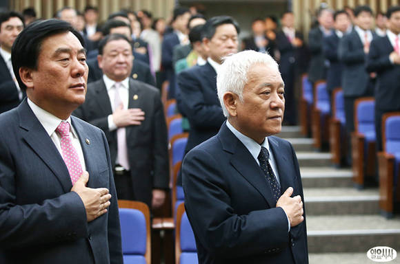[포토] 국민의례하는 김한길-박기춘