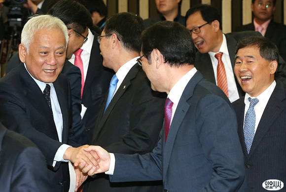 김한길 민주당 대표(사진 왼쪽)와 이용섭 의원이 7일 오전, 국회에서 열린 의원총회에서 대화를 나누고 있다.일요시사=나경식 기자(rusia1973@ilyosisa.co.kr)