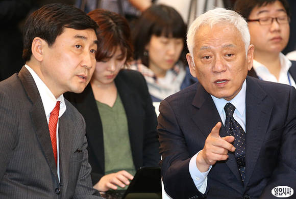 7일 오후 서울 여의도 국회 귀빈식당에서 경제민주화포럼, 참여연대, 민변 공동 주최로 열린 '재벌·대기업 불공정·횡포 피해 사례 발표회'에서 민주당 이종걸 의원이 김한길 민주당 신임대표(사진 오른쪽)와 대화를 나누고 있다.일요시사=나경식 기자(rusia1973@ilyosisa.co.kr)