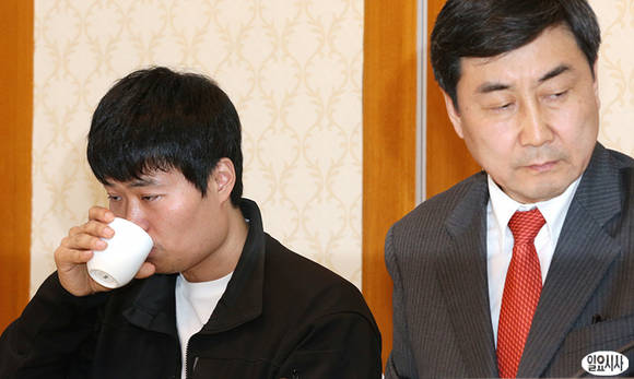 7일 오후 서울 여의도 국회 귀빈식당에서 경제민주화포럼, 참여연대, 민변 공동 주최로 열린 '재벌·대기업 불공정·횡포 피해 사례 발표회'에서 이창섭 남양유업 대리점피해자협의회 대표(사진 왼쪽)와 이종걸 의원이 착찹한 표정을 짓고 있다.일요시사=나경식 기자(rusia1973@ilyosisa.co.kr)