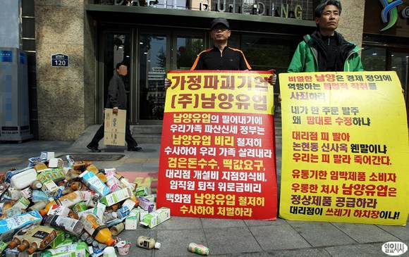 남양유업 영업사원의 폭언과 제품 떠넘기기로 비난이 일고 있는 가운데 8일 오전 서울 중구 남양유업 본사 앞에서 남양유업대리점 피해자협의회 소속 대리점주들이 부당행위 규탄집회를 열고 있다.