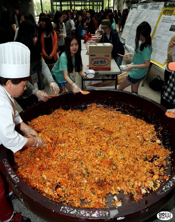 22일 오전 서울 이화여자대학교 학생문화관에서 열린 '이화인 한솥밥 먹기' 행사에서 학생들이 300인분 규모의 비빔밥을 나눠주고 있다.