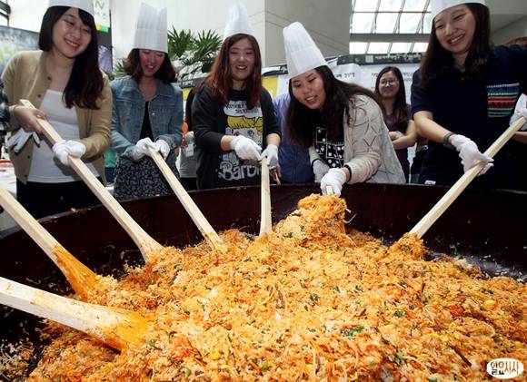 22일 오전 서울 이화여자대학교 학생문화관에서 열린 '이화인 한솥밥 먹기' 행사에서 학생들이 300인분 규모의 비빔밥을 만들고 있다.