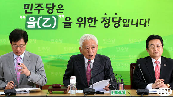 김한길 민주당 대표(사진 가운데)가 22일 서울 영등포구 중앙당사 회의실에서 열린 최고위원회의에서 모두발언하고 있다.