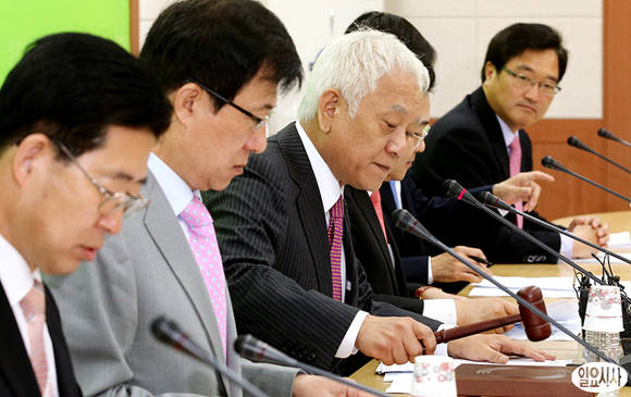 김한길 민주당 대표(왼쪽)와 전병헌 원내대표가 22일 서울 영등포구 중앙당사 회의실에서 열린 최고위원회의서 의사봉을 두드리고 있다.