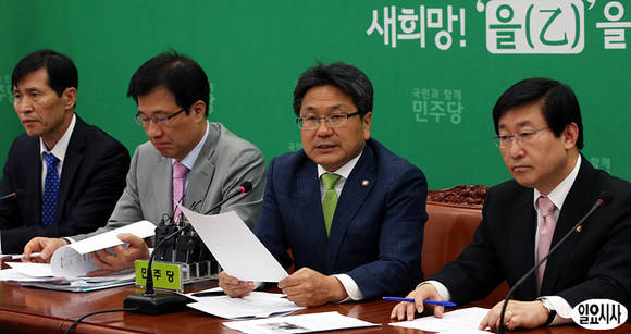 강기정 5·18 민주화운동왜곡대책특별위원장(사진 오른쪽에서 두 번째)이 22일 오전 국회에서 열린 5·18 민주화운동왜곡대책특위와 미디어홍보특위의 연석회의에서 5·18 역사 왜곡 논란을 빚은 종합편성채널 TV조선과 채널A의에 대한 대응 방침을 밝히고 있다.