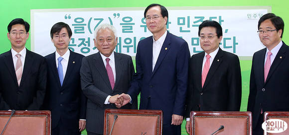 김한길 민주당 대표(사진 왼쪽에서 세 번째)가 22일 서울 영등포구 중앙당사 회의실에서 열린 노대래 공정거래위원장(사진 오른쪽에서 세 번째)과의 면담에서 악수하고 있다. 왼쪽부터 양승조, 조경태 최고위원, 김 대표, 노 위원장, 전병헌 원내대표, 우원식 최고위원