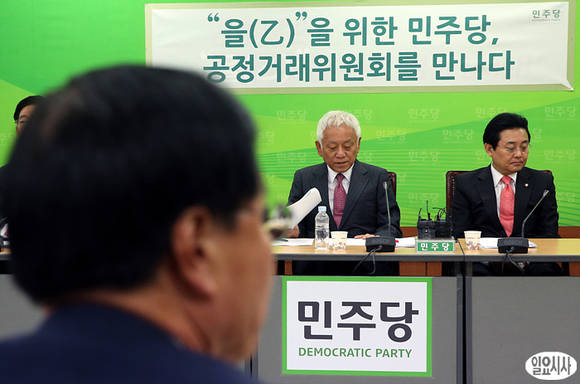 김한길 민주당 대표(사진 가운데)가 22일 서울 영등포구 중앙당사 회의실에서 열린 노대래 공정거래위원장과의 면담에서 발언하고 있다.