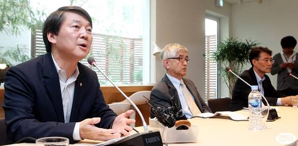 안철수 무소속 의원이 22일 오후 서울 마포구 서교동 창비카페에서 기자회견을 열고 싱크탱크 성격의 정책네트워크 '내일' 창립 계획을 공식 발표하고 있다. 이날 안 의원은 '내일' 이사장에 최장집 고려대 명예교수(가운데)를, 소장에는 장하성 전 안철수 대선캠프 국민정책본부장(오른쪽)을 각각 임명했다.