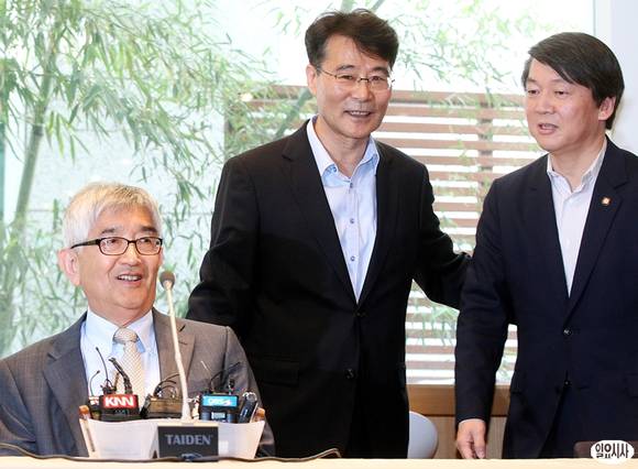 안철수 무소속 의원이 22일 오후 서울 마포구 서교동 창비카페에서 싱크탱크 성격의 정책네트워크 '내일' 창립 계획을 공식 발표 기자회견을 갖기 위해 입장하고 있다. 이날 안 의원은 '내일' 이사장에 최장집 고려대 명예교수(왼쪽)를, 소장에는 장하성 전 안철수 대선캠프 국민정책본부장(가운데)을 각각 임명했다.