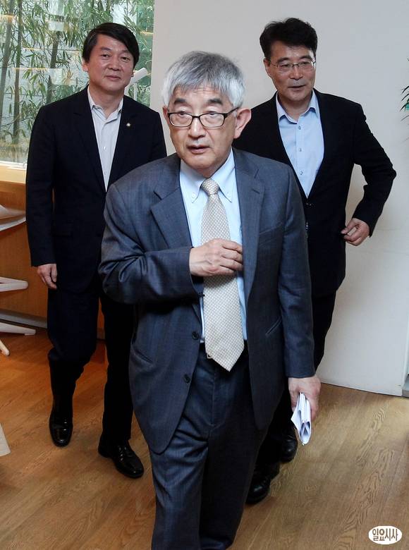 안철수 무소속 의원이 22일 오후 서울 마포구 서교동 창비카페에서 기자회견을 열고 싱크탱크 성격의 정책네트워크 '내일' 창립 계획을 공식 발표한 후 '내일' 이사장에 임명된 최장집 고려대 명예교수(가운데)와 소장에 임명된 장하성 전 안철수 대선캠프 국민정책본부장(오른쪽)과 나서고 있다.