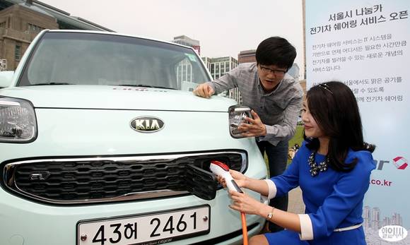 22일 오후 서울 중구 서울광장에서 카 셰어링 업체 씨티카 관계자가 시민들에게 '서울시 나눔카 전기차 셰어링 서비스'를 설명하고 있다.