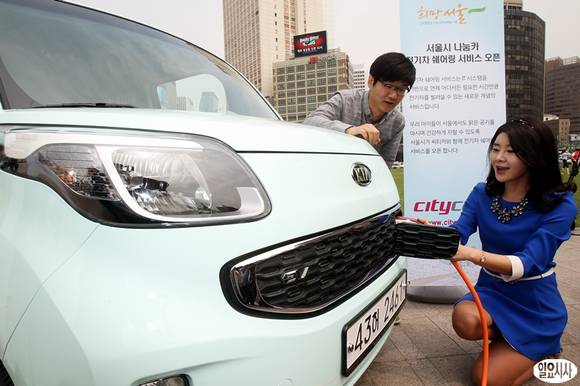 22일 오후 서울 중구 서울광장에서 카 셰어링 업체 씨티카 관계자가 시민들에게 '서울시 나눔카 전기차 셰어링 서비스'를 설명하고 있다.