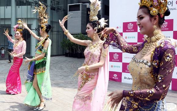23일 오후 서울 청계광장에서 열린 '2013 하나투어 여행박람회' 개막기념 공연에서 태국 3대 쇼의 하나인 '아프로디테쇼' 현지 무용단원들이 화려한 춤을 선보이고 있다.