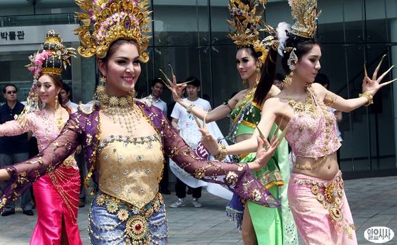 23일 오후 서울 청계광장에서 열린 '2013 하나투어 여행박람회' 개막기념 공연에서 태국 3대 쇼의 하나인 '아프로디테쇼' 현지 무용단원들이 화려한 춤을 선보이고 있다.