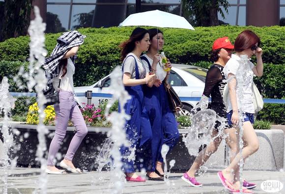 서울의 한 낮 최고 기온이 30도까지 오르면서 올 들어 가장 더운 날씨를 기록한 23일 오후 서울 광화문광장 분수대에서 시민들이 볕을 피해 걸음을 재촉하고 있다.