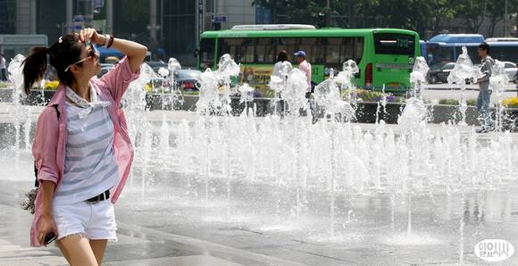 서울의 한 낮 최고 기온이 30도까지 오르면서 올 들어 가장 더운 날씨를 기록한 23일 오후 서울 광화문광장 분수대 옆 길로 한 시민이 걸음을 재촉하고 있다.