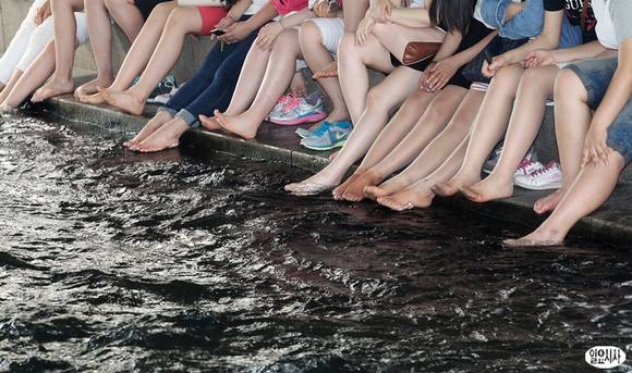 서울의 한 낮 최고 기온이 30도까지 오르면서 올 들어 가장 더운 날씨를 기록한 23일 오후 서울 청계천을 찾은 시민들이 더위를 식히고 있다.