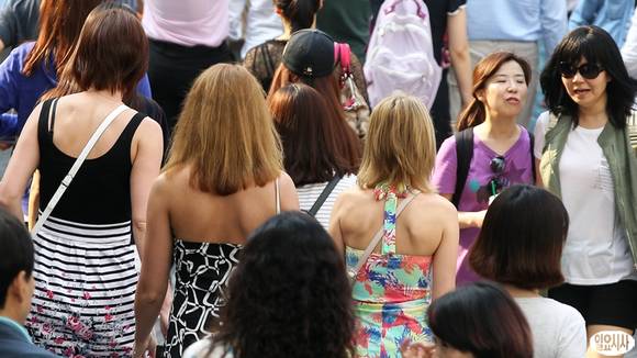 때이른 무더위가 계속된 24일 오후 서울 명동거리에 외국인들이 시원한 옷차림을 하고 걸음을 재촉하고 있다.
