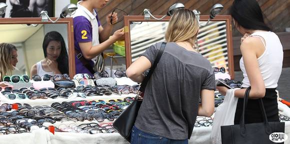 때이른 무더위가 계속된 24일 오후 서울 명동거리에 시민들이 썬글라스를 고르고 있다.