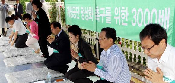 27일 오전 서울 여의도 국회 정문 앞에서 김성곤 민주당 의원을 비롯한 민주당 의원들과 종교인 등이 참석, '개성공단 정상화 촉구를 위한 3000배'를 하고 있다.