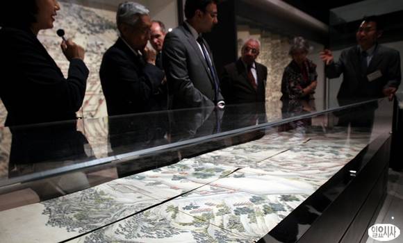 27일 오후 서울 안암동 고려대 100주년 기념관을 찾은 주한외국대사들이 국보 제249호인 동궐도(東闕圖)에 대해 설명을 듣고 있다.