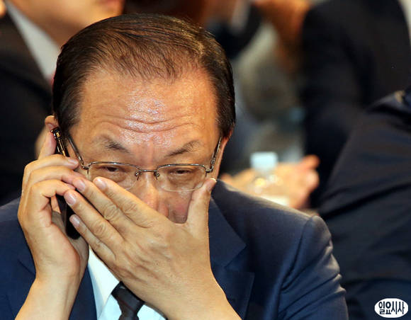 황우여 새누리당 대표가 28일 오전, 국회에서 열린 '농업ㆍ농촌 지속가능성장 위한 미래전략 세미나' 참석 도중 갑자기 걸려온 전화를 받고 있다.