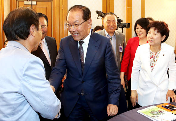 황우여 새누리당 대표(사진가운데)가 28일 오전 국회에서 열린 '농업ㆍ농촌 지속가능성장 위한 미래전략 세미나'에서 관계자와 악수를 나누고 있다.