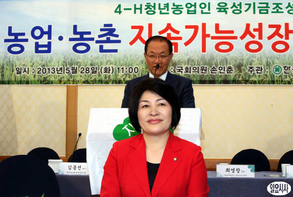손인춘 새누리당 의원(사진 가운데)이 28일 오전 국회에서 열린 '농업ㆍ농촌 지속가능성장 위한 미래전략 세미나'에 참석한 자리에서 웃음 짓고 있다.