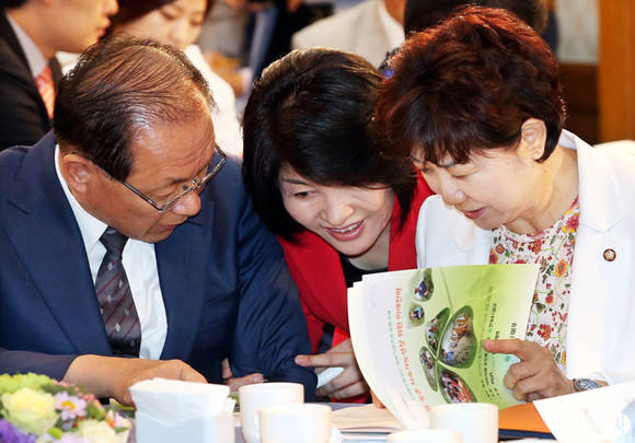 새누리당 황우여 대표(사진 왼쪽)와 손인춘 의원(사진 가운데)이 28일 오전 국회에서 열린 '농업ㆍ농촌 지속가능성장 위한 미래전략 세미나'에 참석해 관련 자료를 보고 있다.