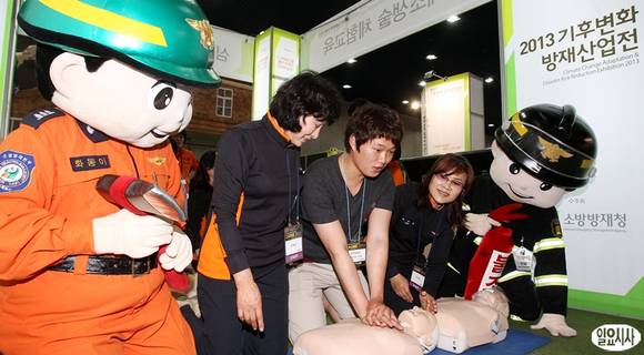 28일 서울 강남구 삼성동 코엑스에서 열린 '2013 기후변화 방재산업전'에서 강남소방서 직원들이 시민들에게 심폐소생술 교육을 진행하고 있다.