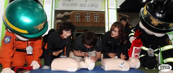 28일 서울 강남구 삼성동 코엑스에서 열린 '2013 기후변화 방재산업전'에서 강남소방서 직원들이 시민들에게 심폐소생술 교육을 진행하고 있다.
