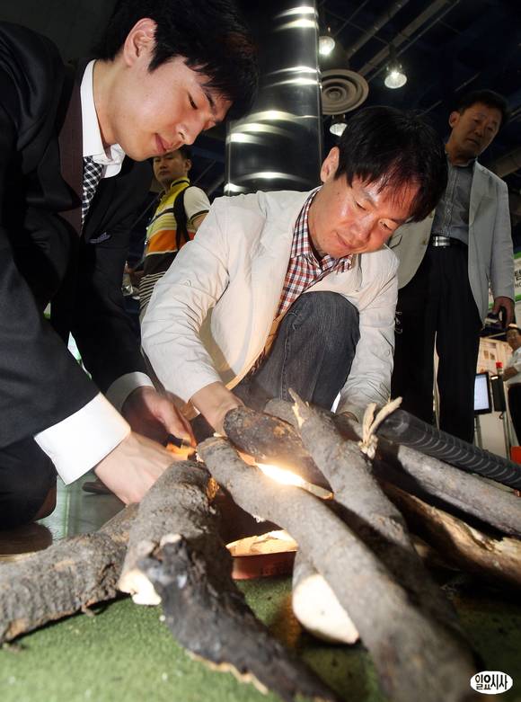 28일 서울 강남구 삼성동 코엑스에서 열린 '2013 기후변화 방재산업전'에서 관람객들이 불 만들기 체험을 하고 있다.