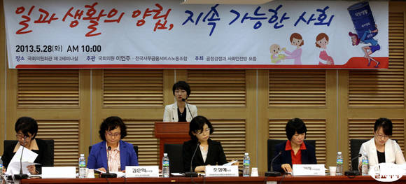 민주당 이언주 의원이 28일 오전 서울 여의도 국회 의원회관에서 열린 '일과 생활의 양립, 지속 가능한 사회' 토론회에서 인사말을 하고 있다.
