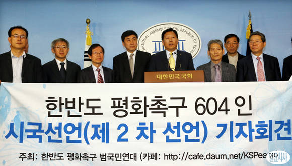 '한반도 평화촉구 범국민연대'(한평련)가 604명의 서명을 받아 28일 국회 정론관에서 한반도 평화 촉구 시국선언을 하고 있다. '범국민연대'는 한반도 평화를 위해 국회가 나설 것을 촉구하고 남북한 정부 당국은 조건없이 대화에 나오라고 요구했다.