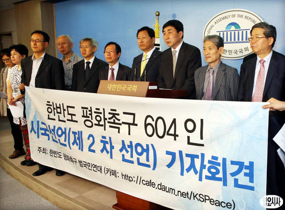 '한반도 평화촉구 범국민연대'가 604명의 서명을 받아 28일 국회 정론관에서 한반도 평화 촉구 시국선언을 하고 있다. '범국민연대'는 한반도 평화를 위해 국회가 나설 것을 촉구하고 남북한 정부 당국은 조건없이 대화에 나오라고 요구했다.