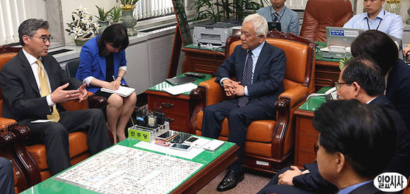 성김 주한 미국대사(사진 왼쪽)가 28일 오후 서울 여의도 국회 민주당 당대표실에서 김한길 대표(사진 가운데)를 예방해 대화를 나누고 있다.