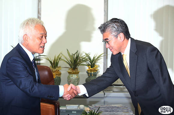 성김 주한 미국대사(사진 오른쪽)가 28일 오후 서울 여의도 국회 민주당 당대표실에서 김한길 대표를 예방해 악수를 나누고있다.